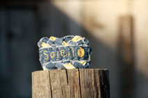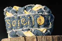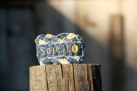 Since making this sunny bangle I have had this song stuck in my head! If you need a spot of sunshine in your day then you need this bangle. This soft, flirty bangle was made from reclaimed frayed denim and vintage yellow and white sheet, braided and hand sewn. The word, Soleil (meaning sun in French) was hand embroidered in a buttery yellow onto a separate strip of frayed denim This strip was hand sewn onto the bangle in the same beautiful yellow embroidery thread.