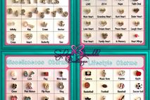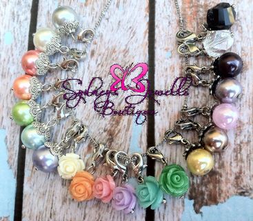 Misc. Charms: Pearl, Lock (Includes small key), Flag, Wine Glass, Clover, Pink Ribbon, FlipFlops, Ring, Pink Feet, Blue Feet, Dog Paw, Dog Bone, White Flower, Black Flower, Pink Flower, Purple Flower