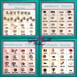 Sentiment Charms: LoVE, 2014, Hope, Faith Oval, Mom Heart, Grandma Heart, Aunt Heart, Sister Heart, Love Heart, Dream Heart, Peace Heart, Laugh Heart, True Heart, Family Heart, In Memory Heart, HeartWings