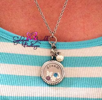 ~*~*~This listing includes: ONE Floating Locket with a 24” Necklace Chain, ONE Stamped Plate of your choice, ONE Dangle of your choice and FIVE charms of your choice. Please list your accessory choices in a note at check out ~*~*~