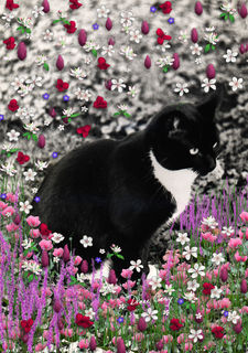 Freckles in Flowers II is part of my Fanciful Animal Images series. Freckles has been my beloved animal companion for 18 years. At the animal shelter he came right over and insisted on going home. When I went to the shelter, Freckles came right over and brushed against me – and then he walked away. He did this several times. To me, that said this tiny tux kitty was both independent and loving. And that has turned out to be so true! This image of Freckles is a delightful addition to any family with his elegance and charm.