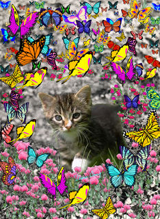Sweetness and Love in Your Day - Emma in Butterflies I is a sweet little gray tabby kitty sitting in nature surrounded by beautiful butterflies. This gray tabby kitten is the centerfold in an outdoor festival of yellow, orange, aqua, lavender, purple and red butterflies. Lemon, amethyst, violet, salmon, magenta and teal butterflies dance and create music that whispers through the field of pink of flowers. Emma has mostly gray fur, with a sweet little white paws and a dab of white on her nose, as she steps through the butterflies. You may experience peace, serenity and healing as you look at my work.