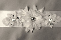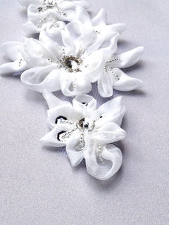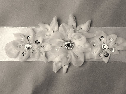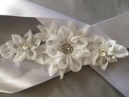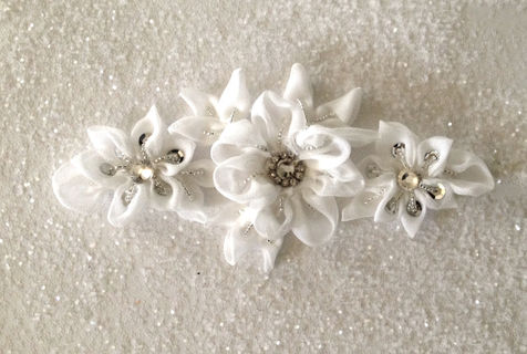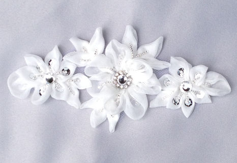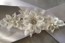 Bridal flower appliqué can be sewn directly to a dress, or we can mount it on a ribbon to make a tie-on sash for you.