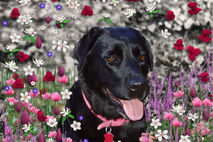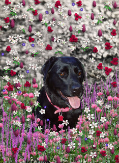 Loyalty, Joy and Delight - Abby in Flowers is a black Labrador dog sitting in nature surrounded by beautiful flowers of lavender, pink, crimson red and white. Abby’s deep brown eyes are quite engaging as she sits in her fanciful bouquet of blossoms of crimson reds, pretty pink poppies, lavender heather and white dogwood, both on the ground and falling from the heavens. Abby is a black Lab puppy with a shiny black nose and a bright red tag with a pink collar around her neck. Abby’s tongue is hanging out, all ready to play in this field of flowers. You may experience peace, serenity and healing as you look at my work.