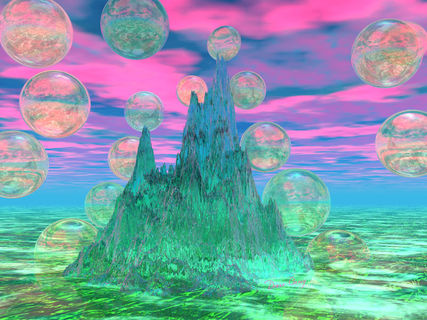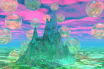 Poetic Mountain at Dawn is a magical world where one knows there is a castle nestled in its arms! Enjoy the mystery and magic of an alternative planet. Peace reigns within! Peer into its center to see what's there to discover. Magnificent rose and pink bubbles cloak this turquoise, purple and teal mountain peak.