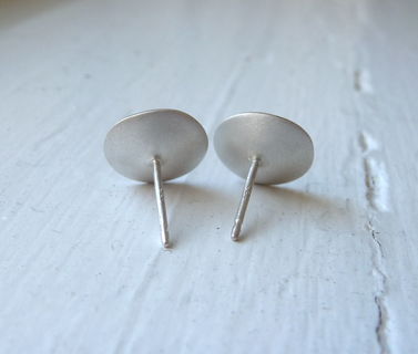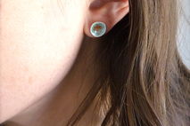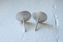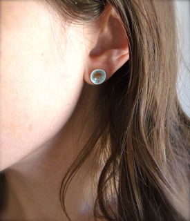 After I make a more organic shape the earrings are filled with crushed glass. Once the surface is well coated I torch fire the disc to fuse the crushed glass to the silver creating an even surface. I repeat the process until the surface of the silver is well covered in a rich hue. Once I solder posts to the back, add a satin finish and make the edges shine.