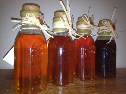 These Square Honey Jars are made from an early 1900's mold. A unique honey jar with an embossed skep and a cork stopper. The corks are sealed in beeswax and tied in raffia with a cute stick pin bee.