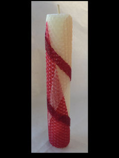 This Candle stands 8" x 1 1/2" and is Hand Rolled 100% Beeswax. It adds a splash of color with pale pink, mauve, and burgundy decorative honeycomb as well.