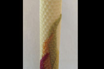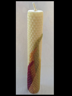 This Candle stands 8" x 1 1/4" and is Hand Rolled 100% Beeswax. It adds a splash of color with olive, rust, burgundy and maize decorative honeycomb as well.