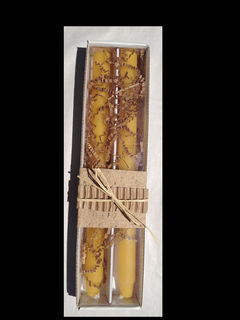 These elegant and fragrant taper candles are 100% Pure Solid Beeswax, nicely boxed and decorated. Our wicks do NOT contain zinc.
