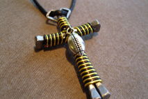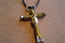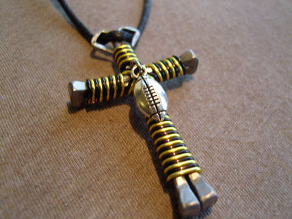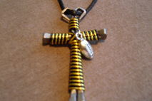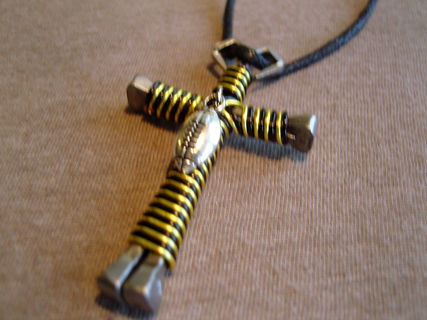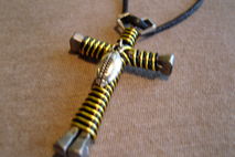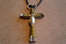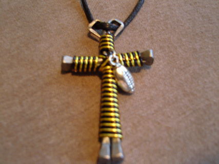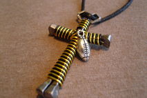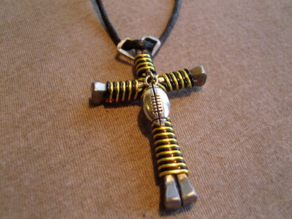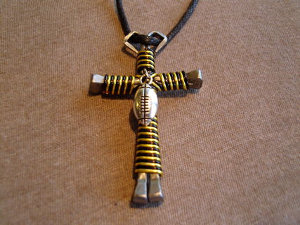 Handmade disciples style cross necklace as shown in pictures. Made with bent horseshoe nails and colored craft wire. Hangs on a synthetic leather cord that is fully adjustable to your preferred hanging length making it the perfect accessory to many outfits.