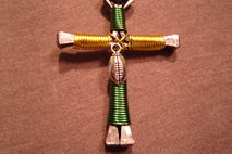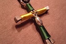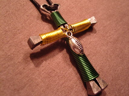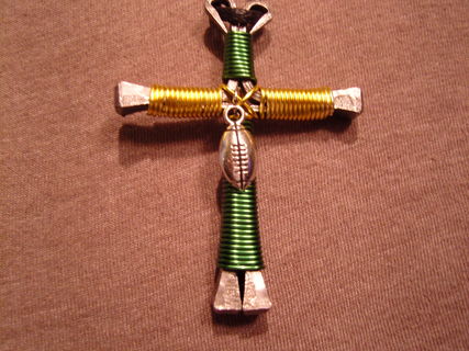 Handmade disciples style cross necklace as shown in pictures. Made with bent horseshoe nails and colored craft wire. Hangs on a synthetic leather cord that is fully adjustable to your preferred hanging length making it the perfect accessory to many outfits.
