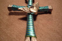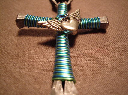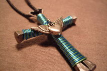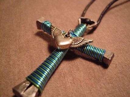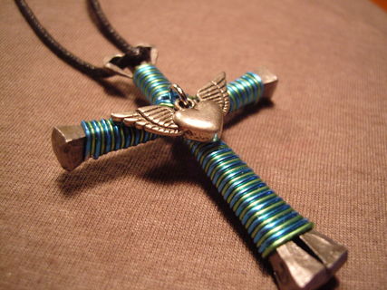 Handmade disciples style cross necklace as shown in pictures. Made with bent horseshoe nails and colored craft wire. Hangs on a synthetic leather cord that is fully adjustable to your preferred hanging length making it the perfect accessory to many outfits.
