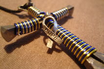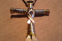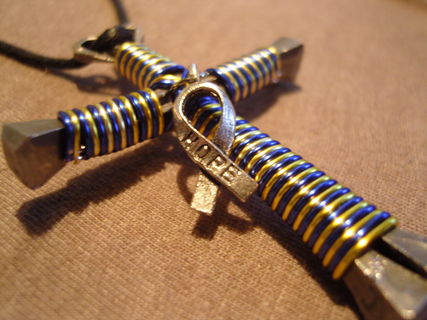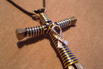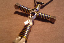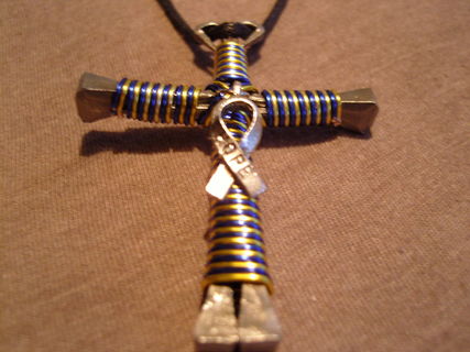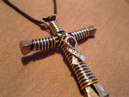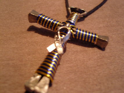 Handmade disciples style cross necklace as shown in pictures. Made with bent horseshoe nails and colored craft wire. Hangs on a synthetic leather cord that is fully adjustable to your preferred hanging length making it the perfect accessory to many outfits.