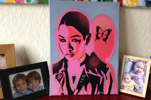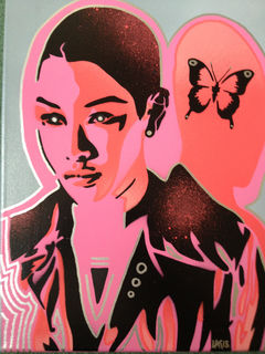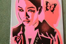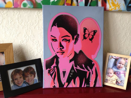 painting of android asian woman made with handcut stencils and spraypaints.