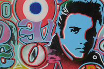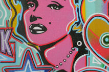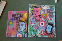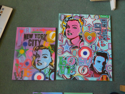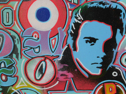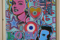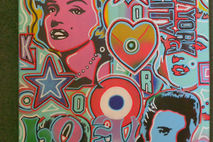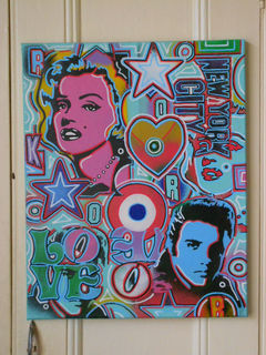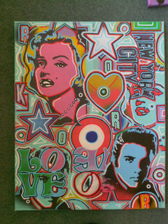 a mix of famous pop art images all blended together on one canvas with handcut stencils,spraypaints and posca detail