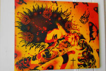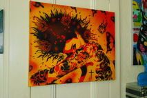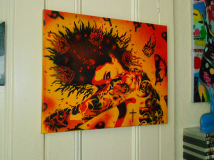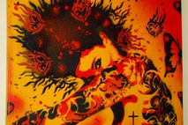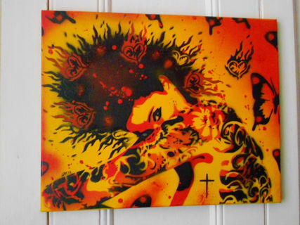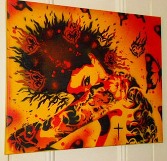 painting of a woman with japanese style tattoos,made with handcut stencils and spraypaints