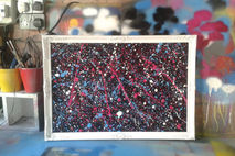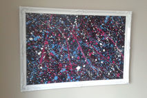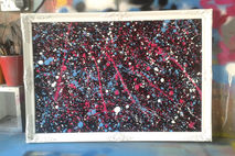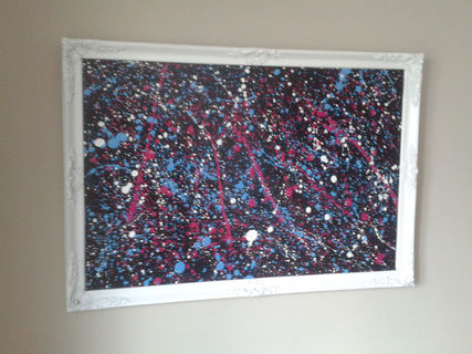 wooden carved antique frame painted with white spray paint, inner made with black heavy board then Pollock style splash's of blue, pink and white spray paint added.
