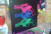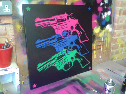 Painted using hand drawn, hand cut stencils and spray paints on a black painted canvas.
