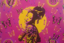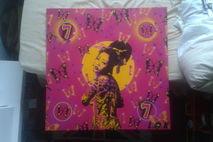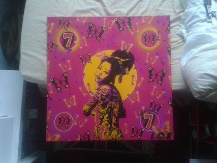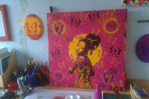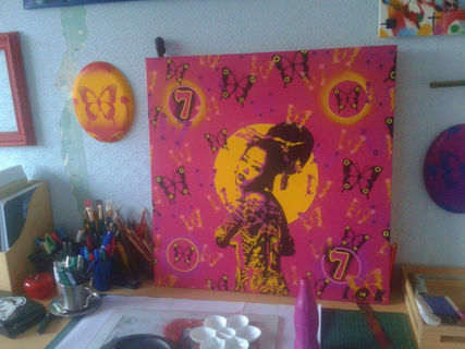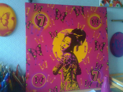 Part of my Planet Asia series, painted using hand drawn, hand cut stencils of Asian tattooed woman and spray paints, butterfly and lucky seven stencils added after over laid over a pink canvas with yellow sun then detail finished off with paint markers,