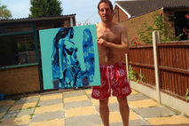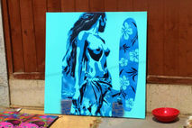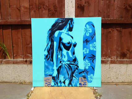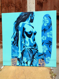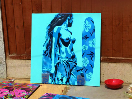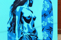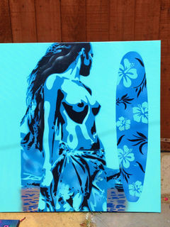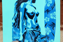 nude islander women with lilies on sarong and surf board with sprayed lilies.
