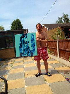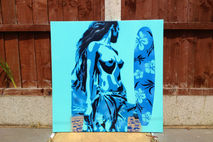 painted using hand drawn, hand cut stencils. one layer blue, second layer black on a turquoise sprayed canvas.