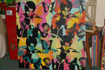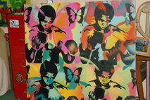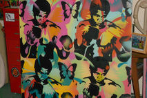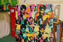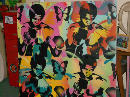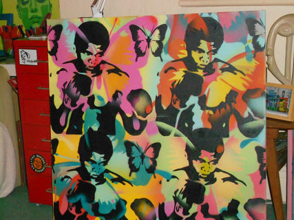 painted using hand cut butterfly stencils for the background with light coloured spraypaint colours,the ali added after,repeated then blended together to give an abstract look.