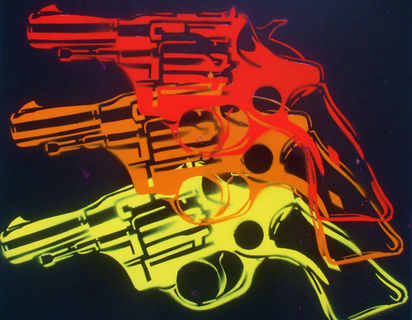 painting made with handcut stencils and spraypaint on canvas by warhols pop gun screen prints.