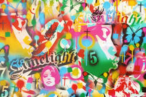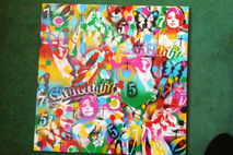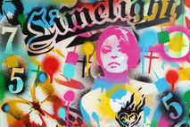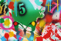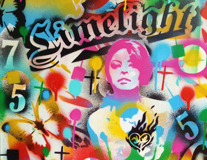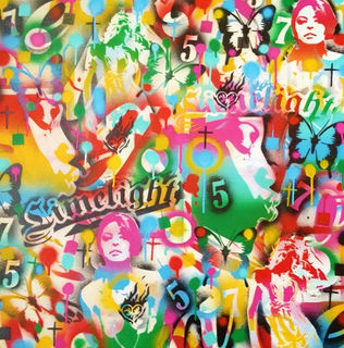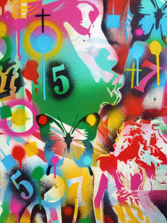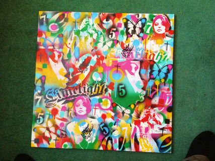 painted using lots of handcut stencils blended together on a large canvas,using several spraypaint colours.bright,vibrant one off original painting,signed and dated by the artist.