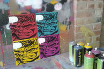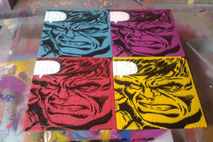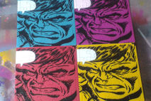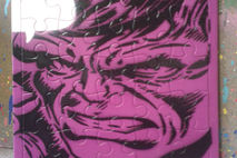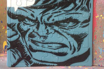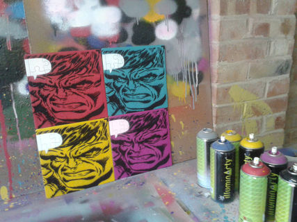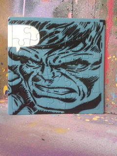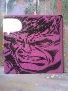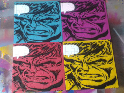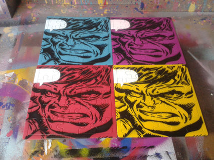 painting of the incredible hulk on 4 square puzzles made with hand cut stencils and spray paints.