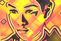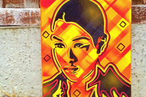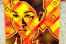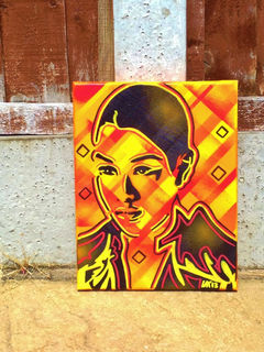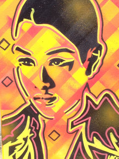 abstract background made with masking tape and spray paints, then single layer stencil of face added and finished off with yellow and red posca paint markers.