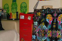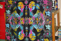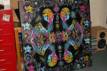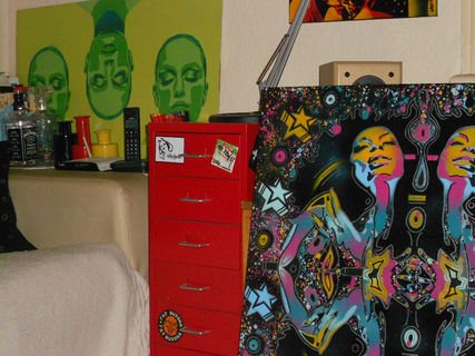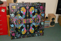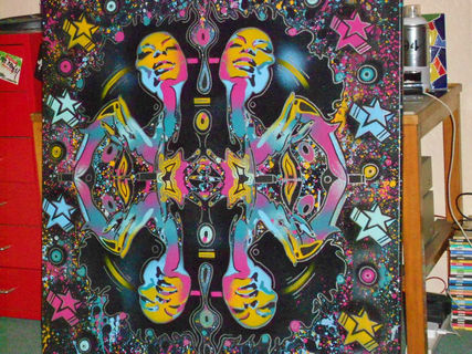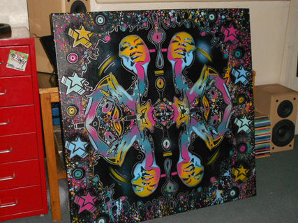 painting of afro haired women mirrorred for symetrical canvas painting,abstract style using handcut stencils and spraypaints,the finished off with black and silver paint markers for extra detail.