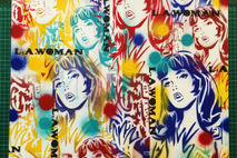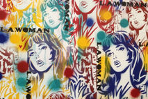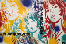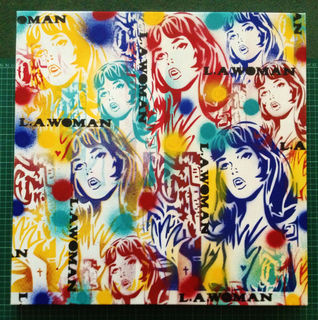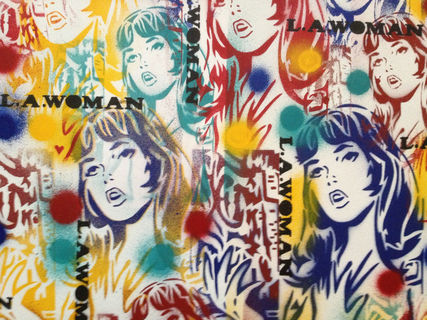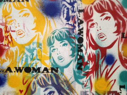 made with handcut stencils and spraypaints,mixed up pop art style painting blending large and small comic girl images with l.a.woman text.