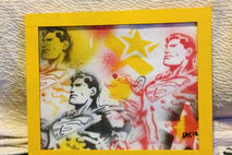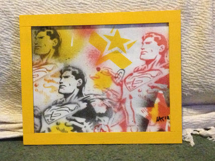 handmade painting framed of superman in a pop art style,you get an original painting on canvas paper (not a print) in a frame ready to hang,signed and dated by the artist.