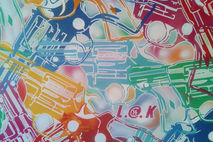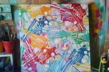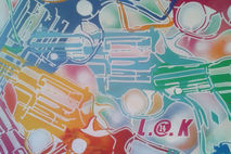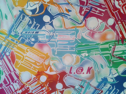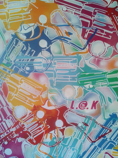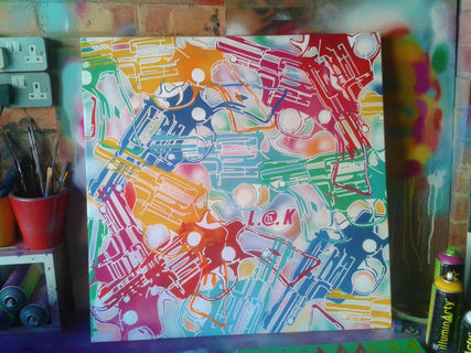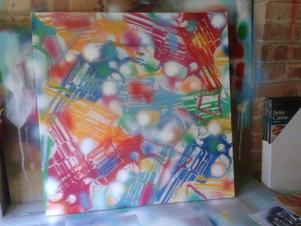 I have taken Andy Warhol's famous revolver created a hand cut stencil with it then blended it together several times on a white canvas using bright, vivid colours then finished it off with extra detail using a whit paint marker.