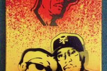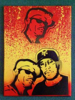 description- spraypainted canvas of the hiphop group gangstarr,tribute to the late guru r.i.p
