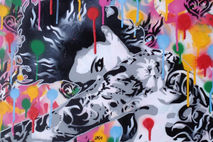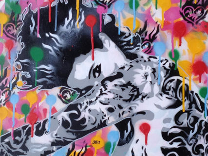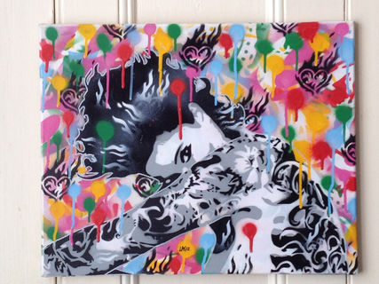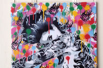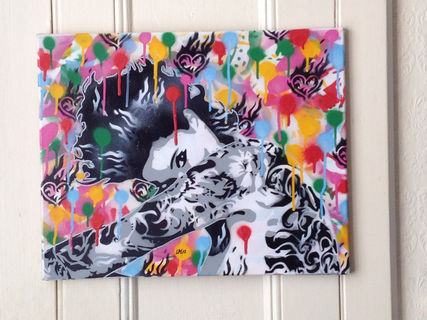 painted using hand cut stencils and spraypaints,3 layer tattooed woman on multi layered stencil background