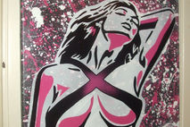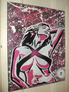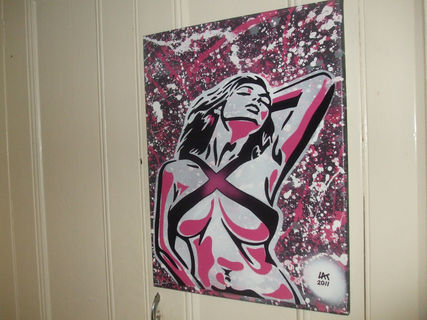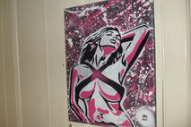 painting made with hand cut stencils and spraypaint on canvas,textured splas background.