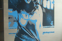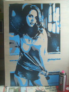 large painting of women,the back ground was paintined with a metallic silver acrylic paint,then the black and blue with stencils and spray paints.