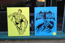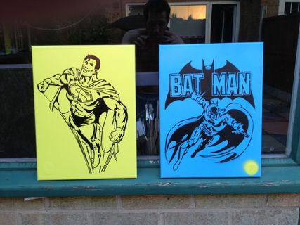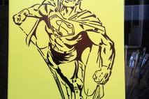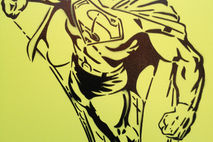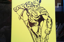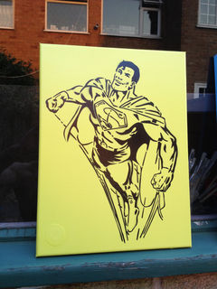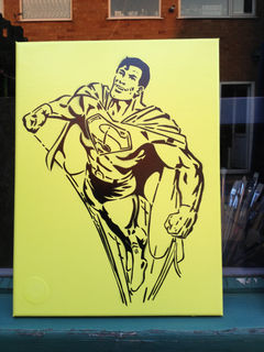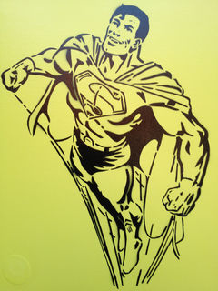 classic clean and simple superman stencil painting made with a hand cut stencil sprayed on yellow background. great gift for adults or kids.