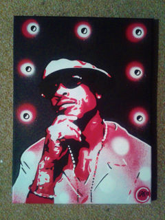 painting of the late, great hip hop mc, Guru from the group Gangstarr made with hand cut stencils and spray paints, detail finished off with posca paint markers.