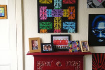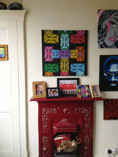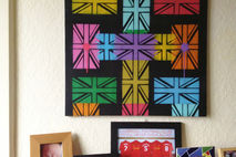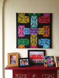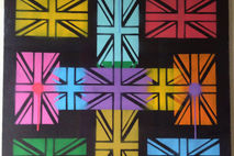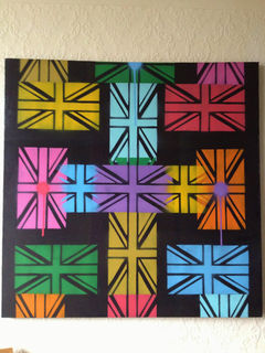 pop art style painting made with handcut union jacks,sprayed in different colors and made in to a cross the spraypaint drips added to reprisent nails