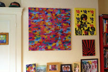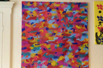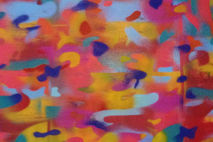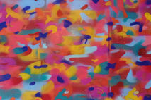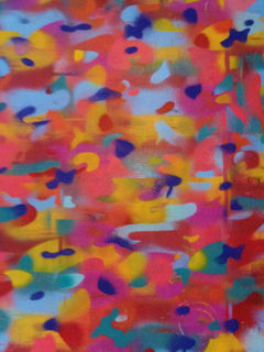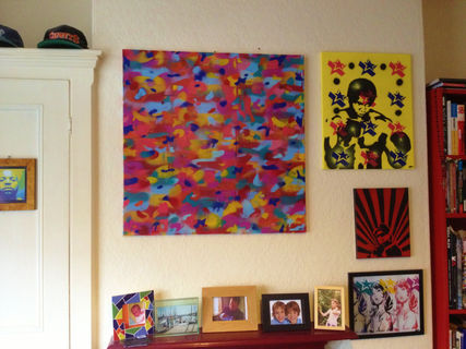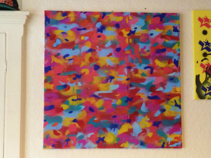 painted using various coloured spraypaints blended as background,then camouflage stencils layered to make a nice abstract painting that would give a lovely blast of colour to any room.