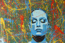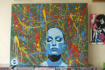 large abstract painting made with handmade stencils and spraypaint,pollock style background with stencil layed on top,quite a textured layered finish.