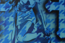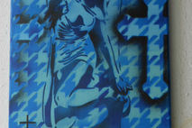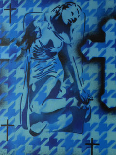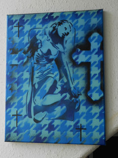 blue dogtooth fashion design pattern background,made with handcut stencils with stencil of women layed on top and crosses.