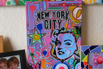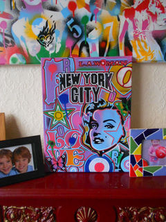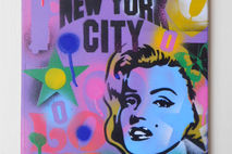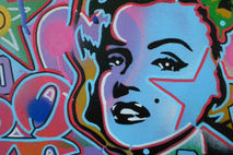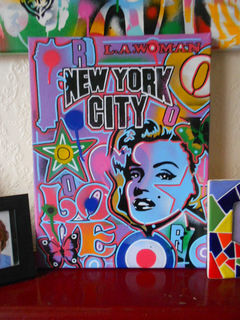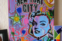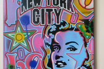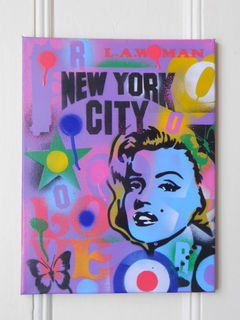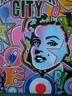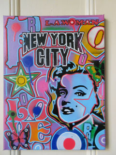 a mix of famous pop art images all blended together on one canvas with handcut stencils,spraypaints and posca detail