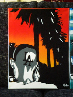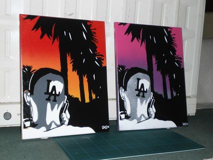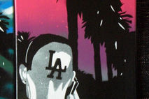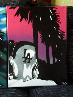 description- picture of man with l.a. shaved into hair,original one off painting,signed and dated by l.@.k.art