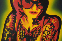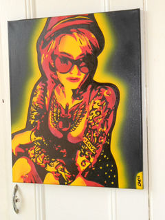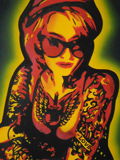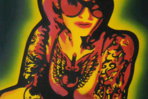 painting from a photo of a tattooed woman,using handcut stencils and spraypaints,finished of with sharpies.