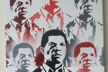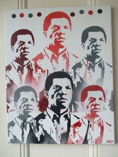 two size stencils,reds greys and black spraypaint on white gloss canvas.
