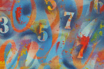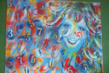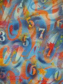 painting made with acrylic painted background then stenciled letters and numbers blended tiogether and also a womans face blended in to using spraypaints on large canvas